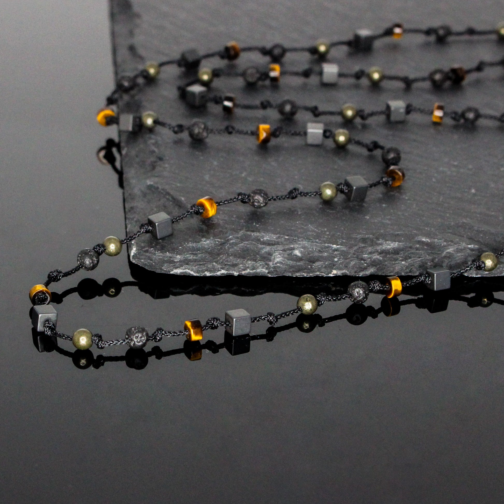 11109 Men's Minimalist Hand-Knotted Necklace with Matte Hematite, Lava Stone, Pyrite and Tiger’s Eye