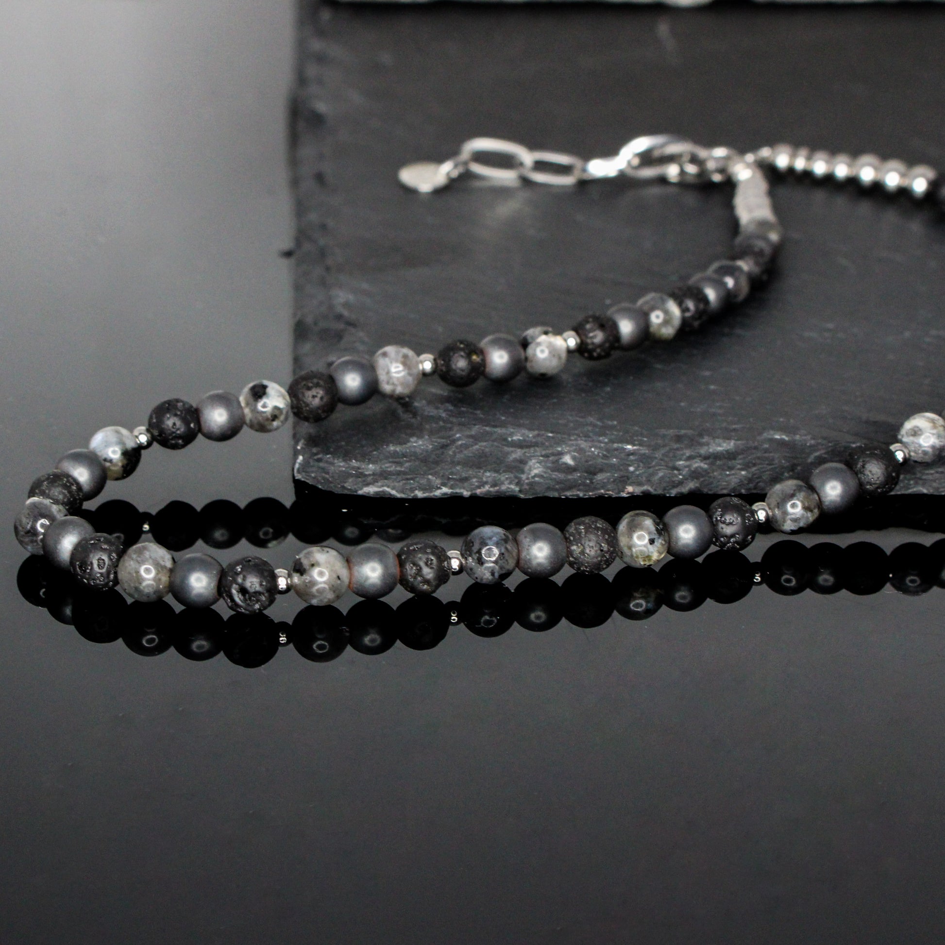 The Men’s 6mm Beaded Necklace is a striking balance of natural strength and modern edge. Lava Stone embodies raw energy and grounding power, Larvikite offers protection and transformation with its subtle silver-blue flashes, and Matte Hematite provides balance and focus. Stainless steel beads accent the design, adding durability and a sleek, metallic contrast.