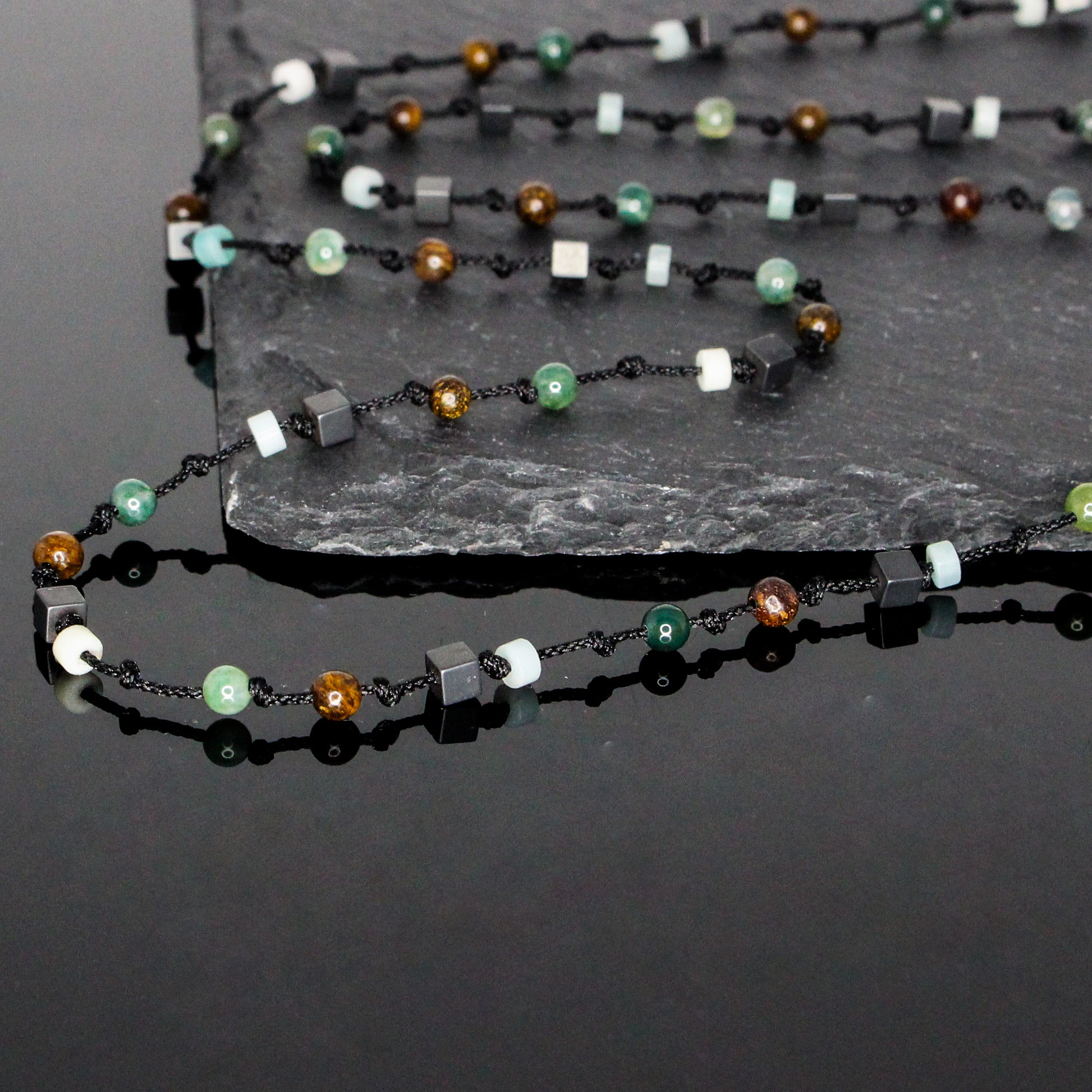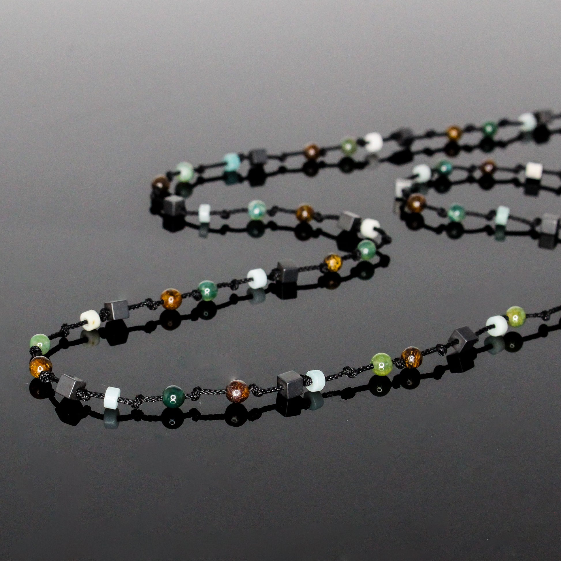 The Men’s Minimalist Hand-Knotted Necklace combines four grounding stones in one refined design. Matte Hematite offers balance and focus, Bronzite embodies resilience and confidence, Moss Agate symbolizes growth and renewal, while Amazonite inspires calmness and harmony.