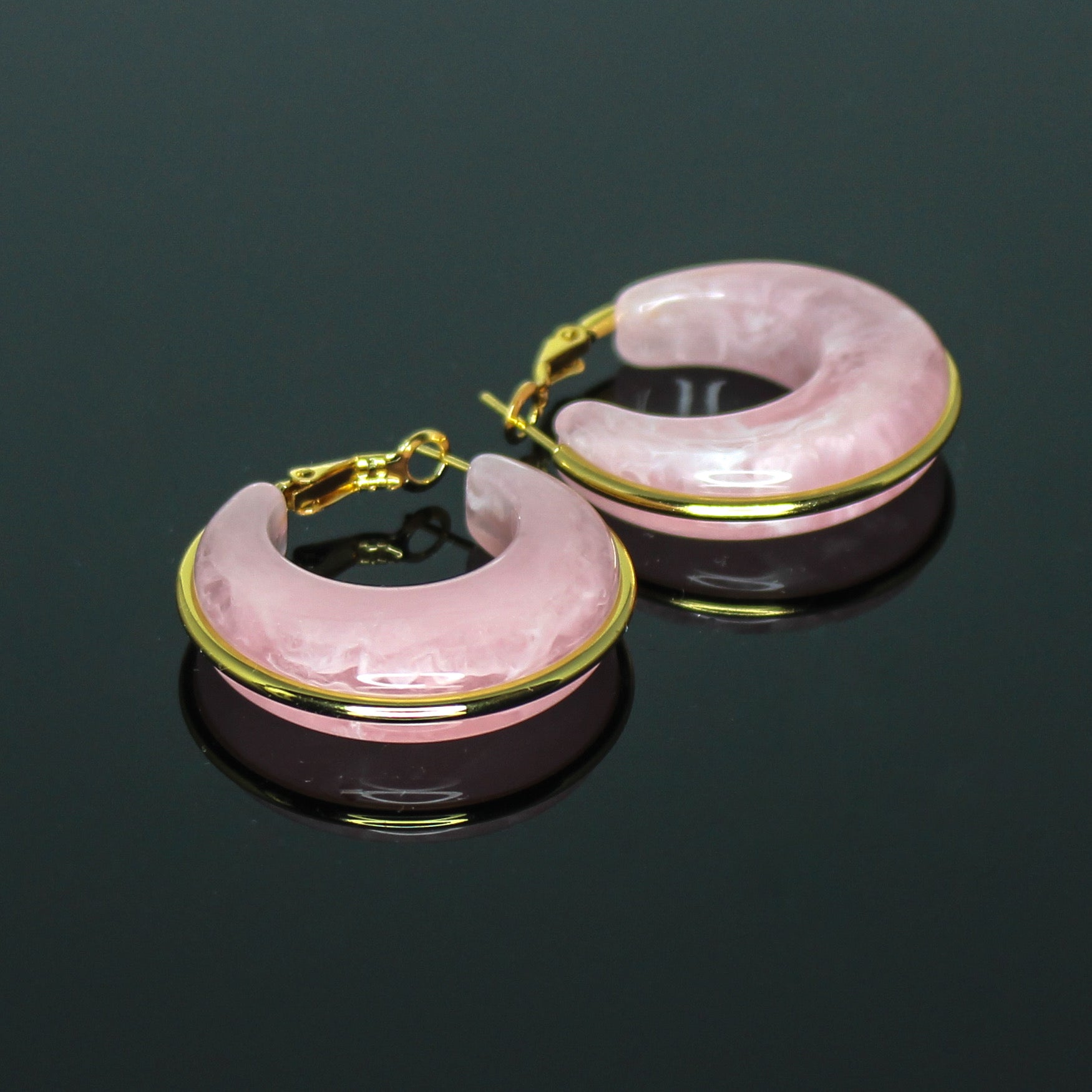 Add a delicate touch of romance to your look with the Soft Rose Pink Hoop Earrings. Crafted from high-quality resin in a soft translucent rose pink with subtle marbled details, these chunky crescent hoops are accented with 18K gold-plated stainless steel trim for a refined, feminine finish. Lightweight yet statement-worthy, they’re perfect for both casual elegance and dressy styling.
