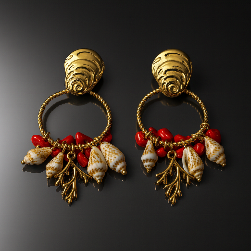 Details: Dangling seashells, coral-style beads, and gold coral branches