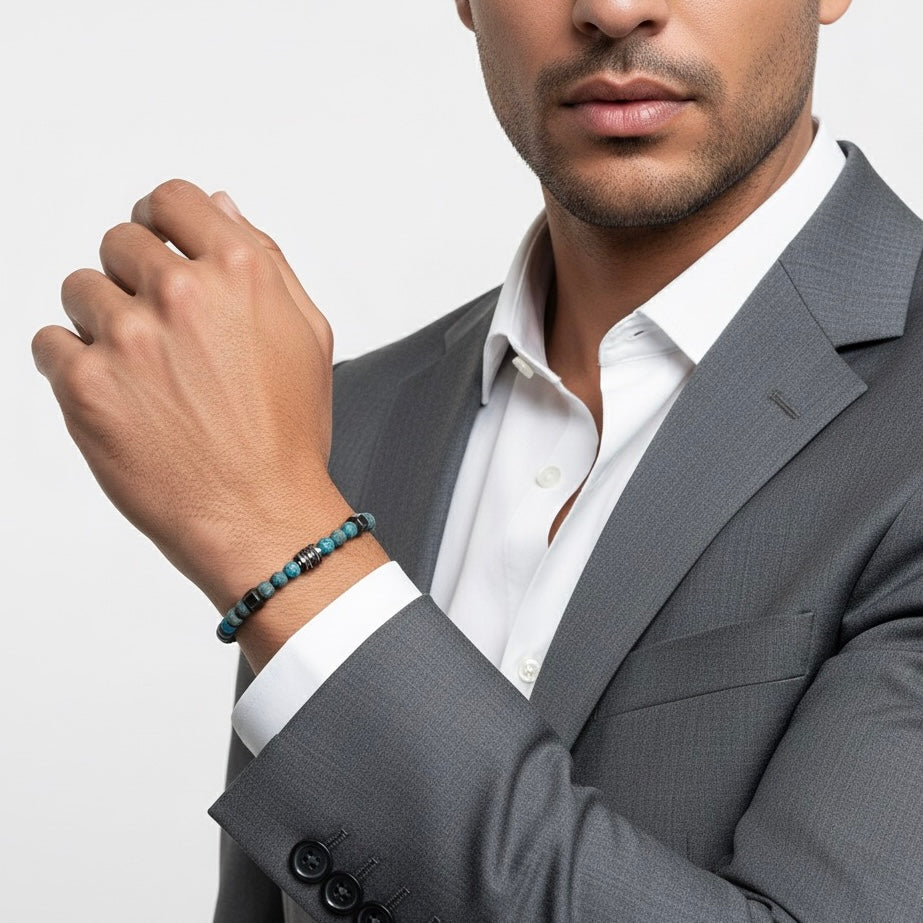 The bracelet features the captivating matte calsilica jasper beads. Known for their vibrant mix of colors and intricate patterns, calsilica jasper exudes a sense of adventure and masculinity. Each bead is carefully selected to showcase its unique patterns, making every bracelet a distinctive piece of art.