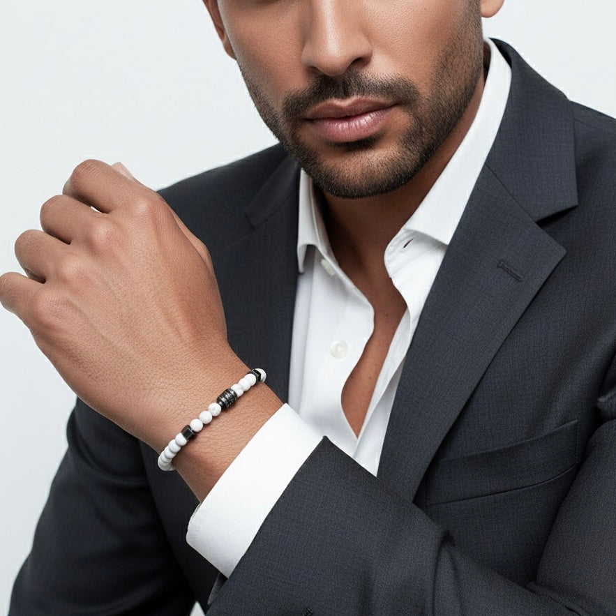 This Matte White Howlite Minimalist Beaded Bracelet is a sleek and masculine accessory that combines the purity of white howlite with rugged design elements. Meticulously handcrafted, this bracelet is designed to elevate your style and make a statement of confident masculinity.