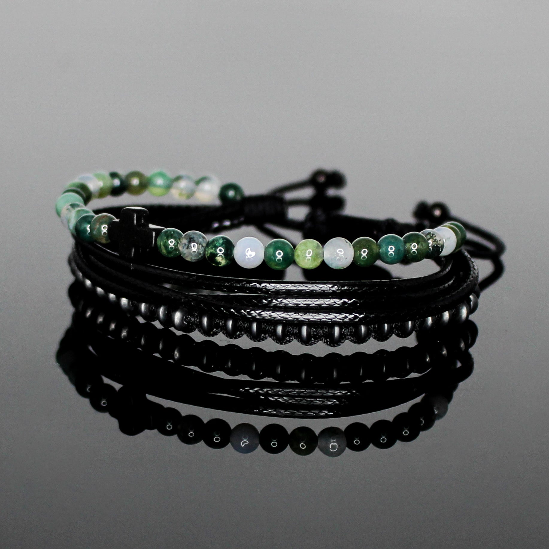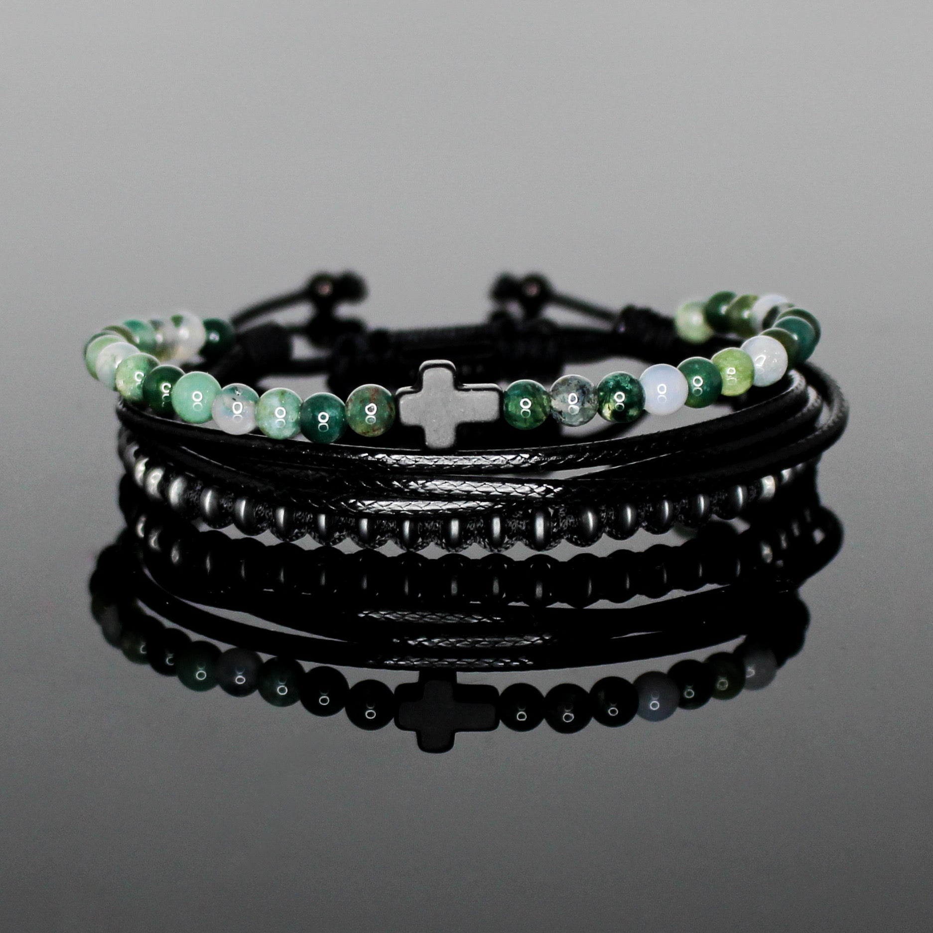 2231 Men’s Black Cross Multi-Layer Bracelet with Moss Agate and Matte Black Hematite
