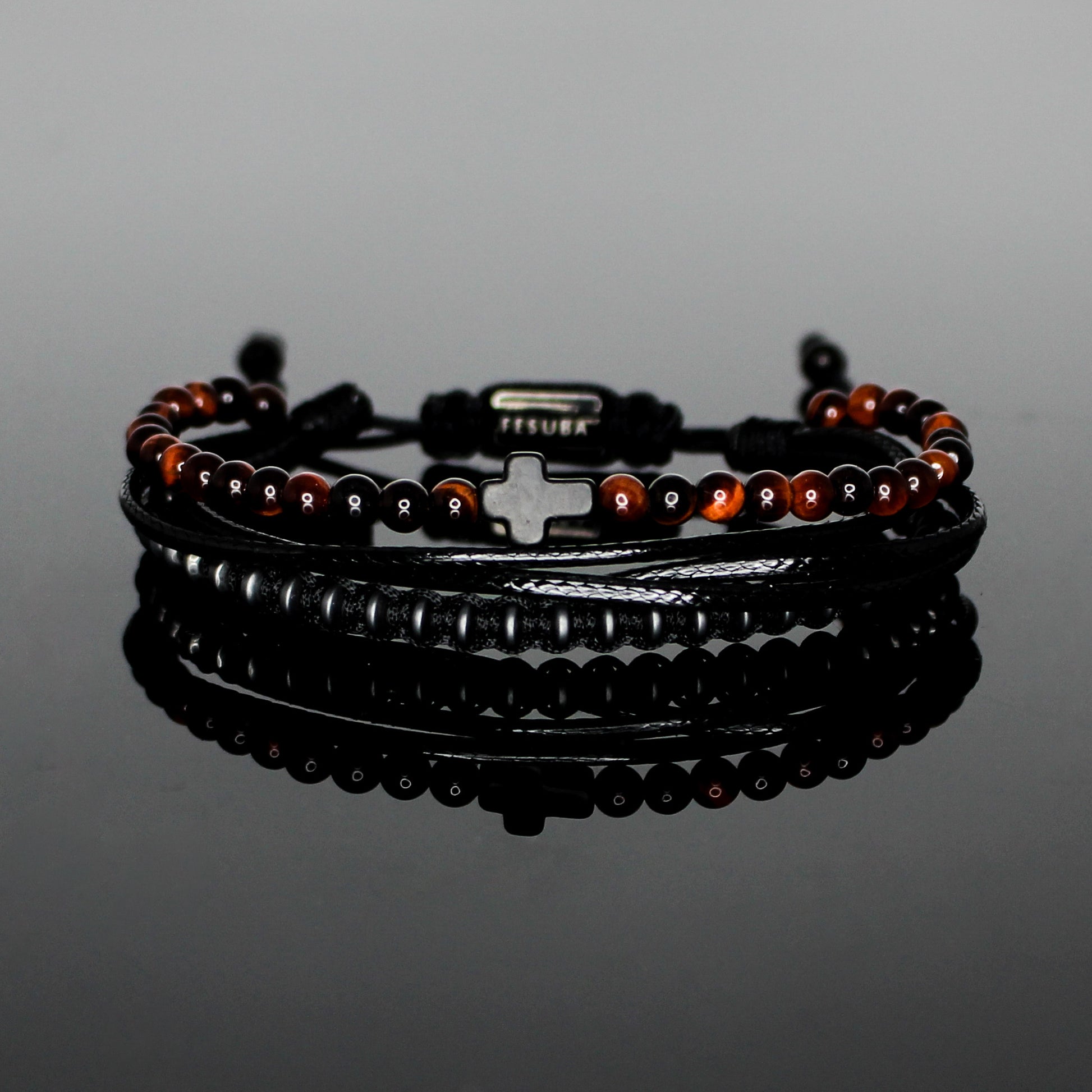 2233 Men’s Black Cross Multi-Layer Bracelet with Red Tiger’s Eye and Matte Black Hematite