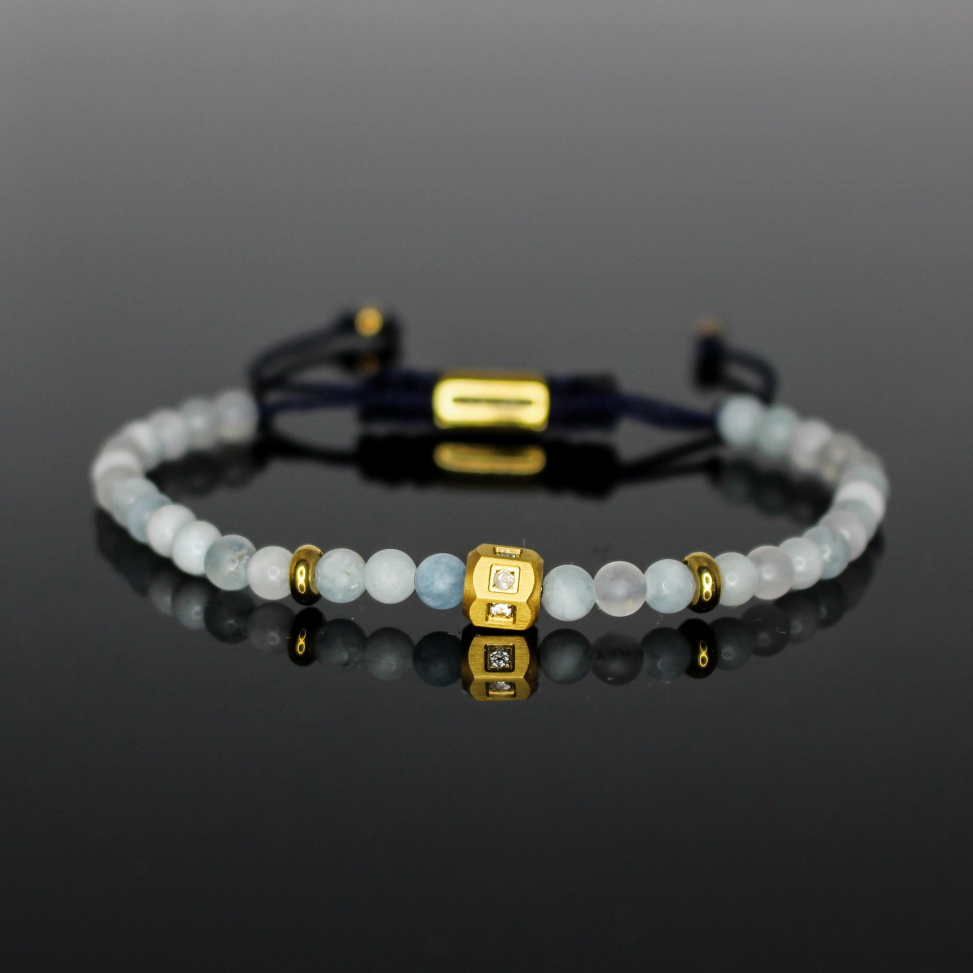 This bracelet is handcrafted with 4mm matte Aquamarine beads, accented by a matte gold stainless steel centerpiece with micro inlay white CZ. Aquamarine, known as the Stone of Serenity and Courage, is believed to soothe the mind, calm the spirit, and inspire clear communication. With its adjustable cord and minimalist design, this bracelet is both elegant and versatile—ideal for everyday wear or thoughtful gifting.
