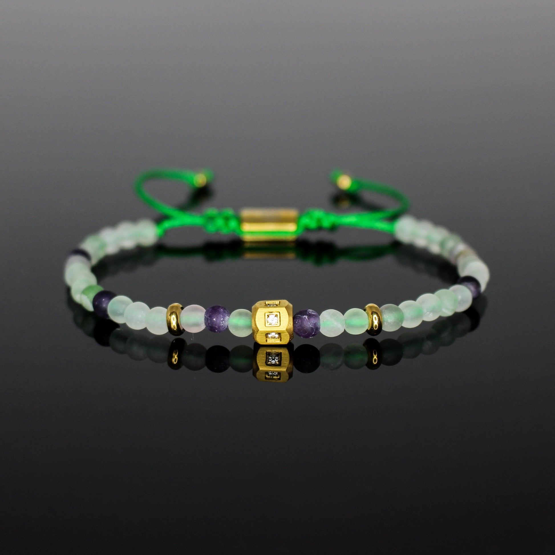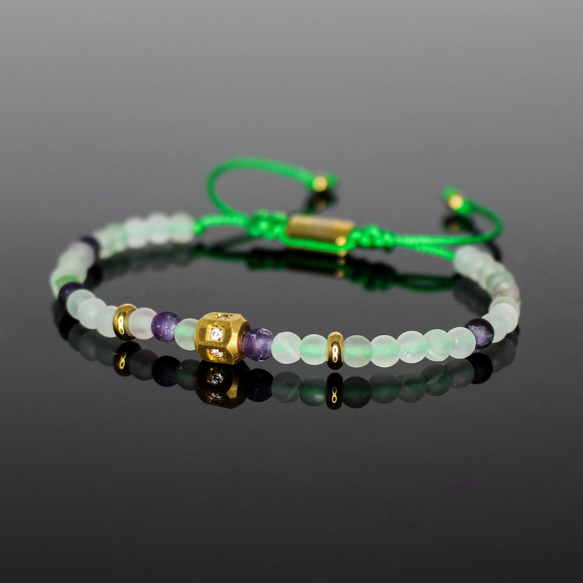 Handcrafted with 4mm matte Fluorite beads, this bracelet is accented by a matte gold stainless steel centerpiece with micro inlay white CZ. Fluorite, known as the Stone of Clarity and Balance, is believed to promote calmness, focus, and clear decision-making. Designed with an adjustable cord, this minimalist piece is both lightweight and versatile—perfect for everyday wear with a refined touch.
