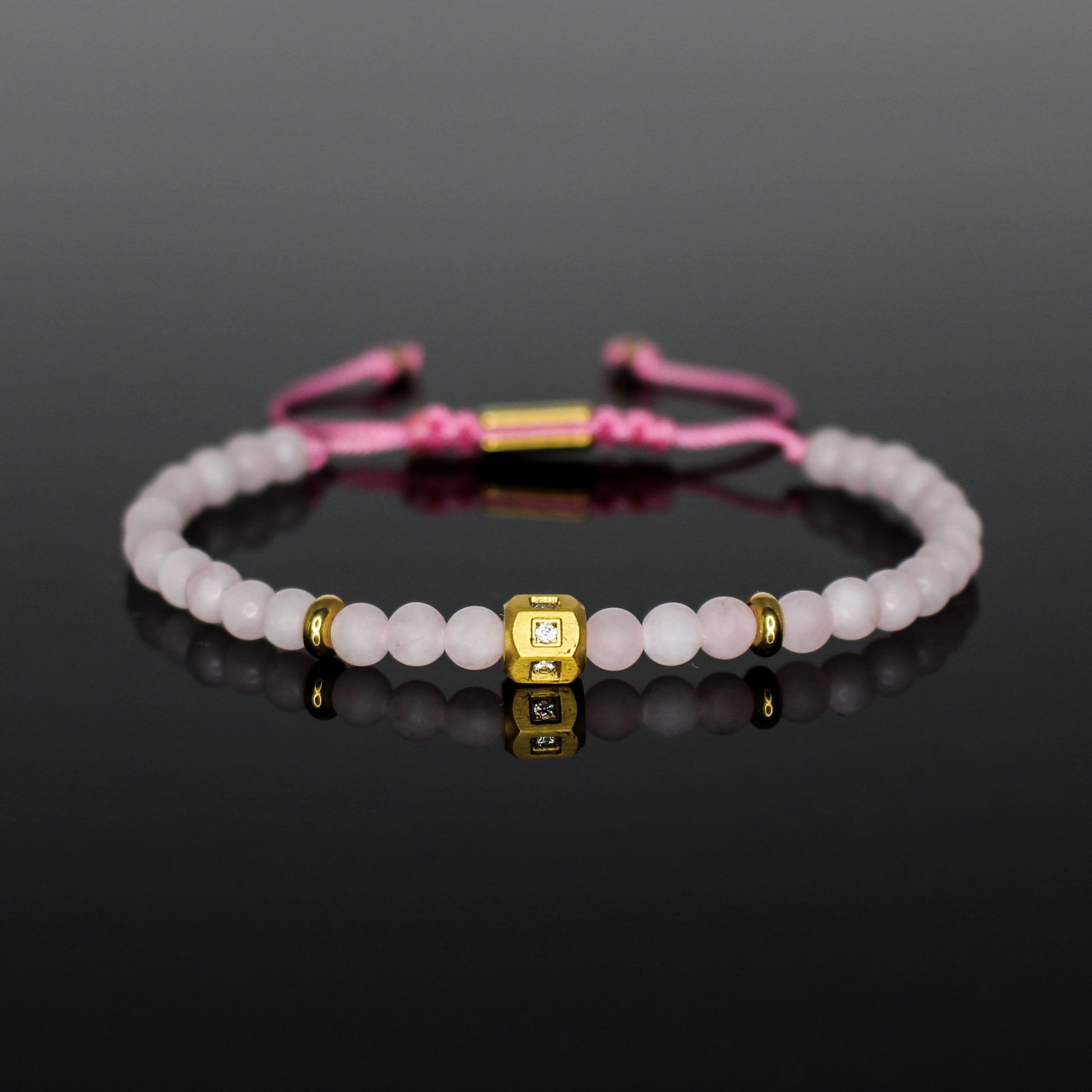 Handcrafted with 4mm matte Rose Quartz beads and finished with a matte gold stainless steel centerpiece featuring micro inlay white CZ, this bracelet is a timeless expression of elegance. Rose Quartz, the Stone of Love, symbolizes compassion, harmony, and emotional healing. Paired with its adjustable cord, this piece is delicate yet versatile—perfect for everyday wear or thoughtful gifting.